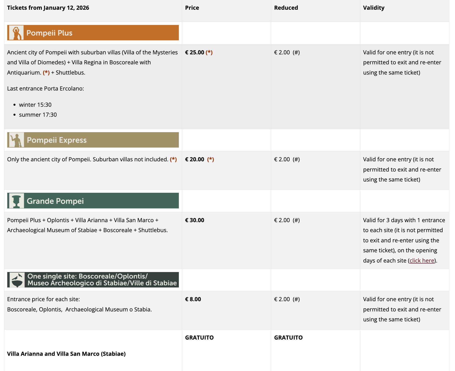 Pompeii Ticket Categories